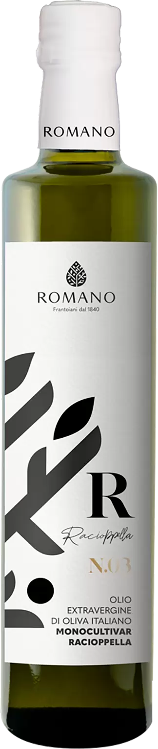Racioppella N°03 er lavet 100 % på oliven af sorten Racioppella, dyrket i bakkeområderne i Sannio-regionen omkring Ponte (provinsen Benevento, Italien)